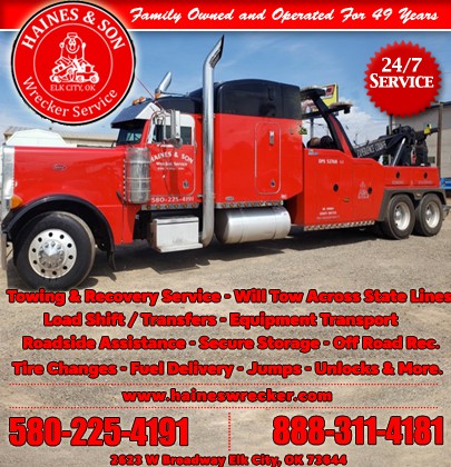 “FAMILY OWNED AND OPERATED FOR 50 YEARS.” We are located in Elk City, OK. We cover a 150-mile radius, but we will tow across state lines. We do 24/7 Towing & Recovery. We are here for your towing needs. Our services include: